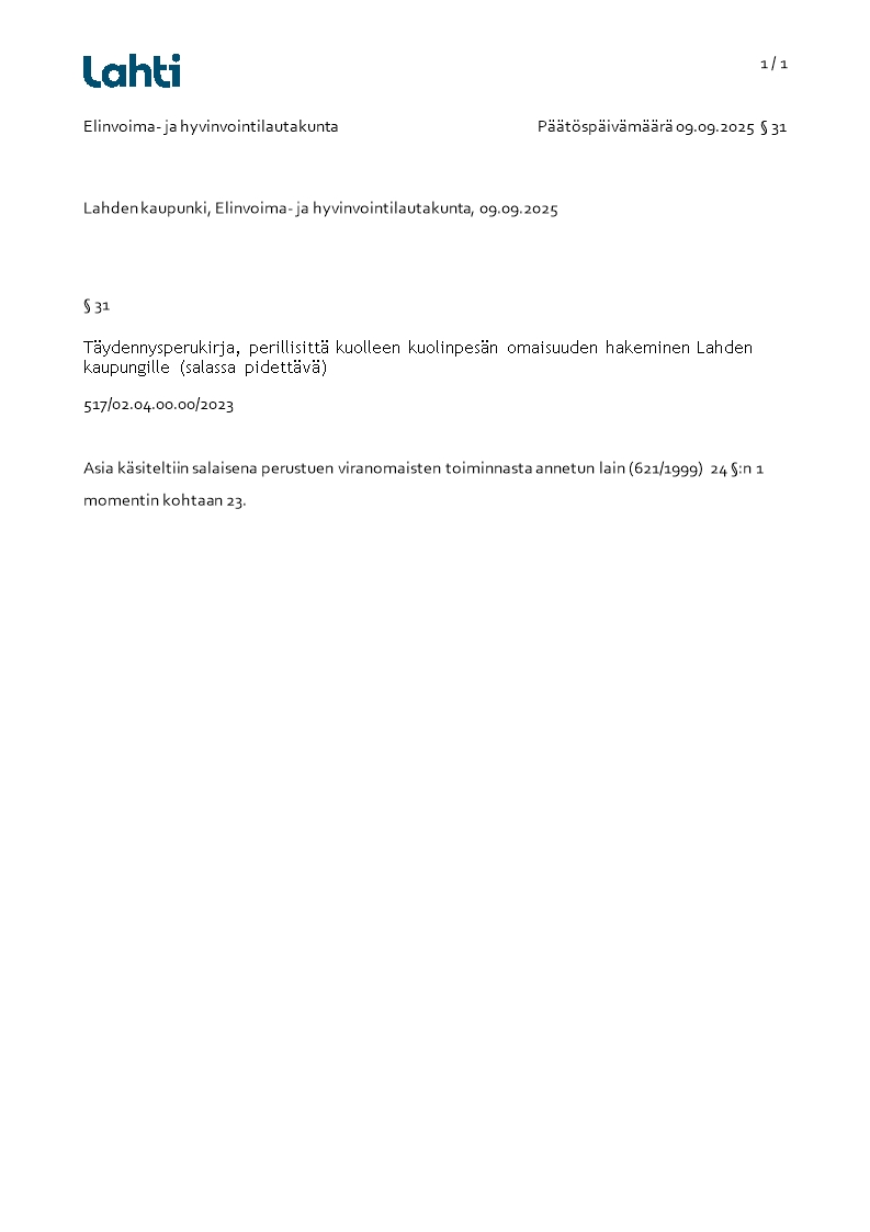 Pöytäkirja 09.09.2025/Pykälä 31