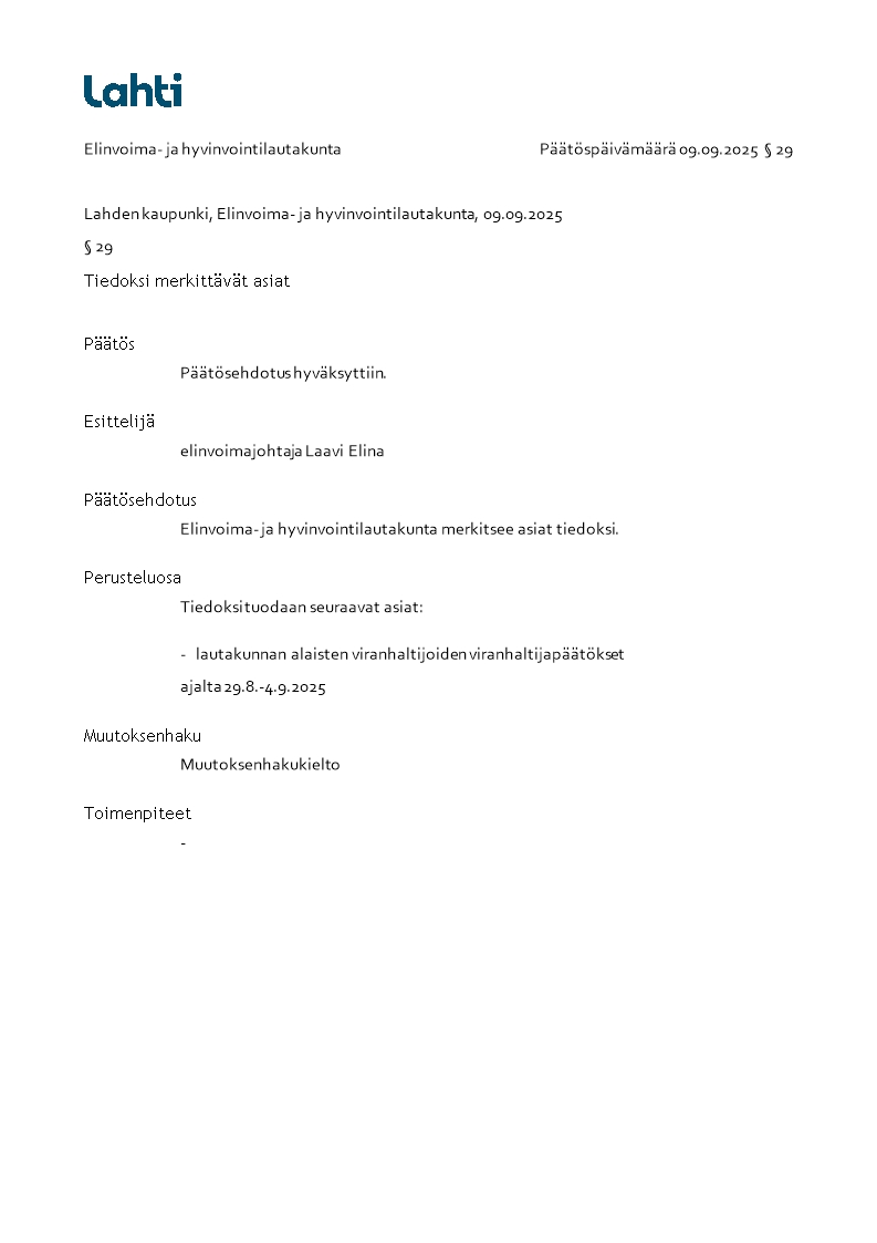Pöytäkirja 09.09.2025/Pykälä 29