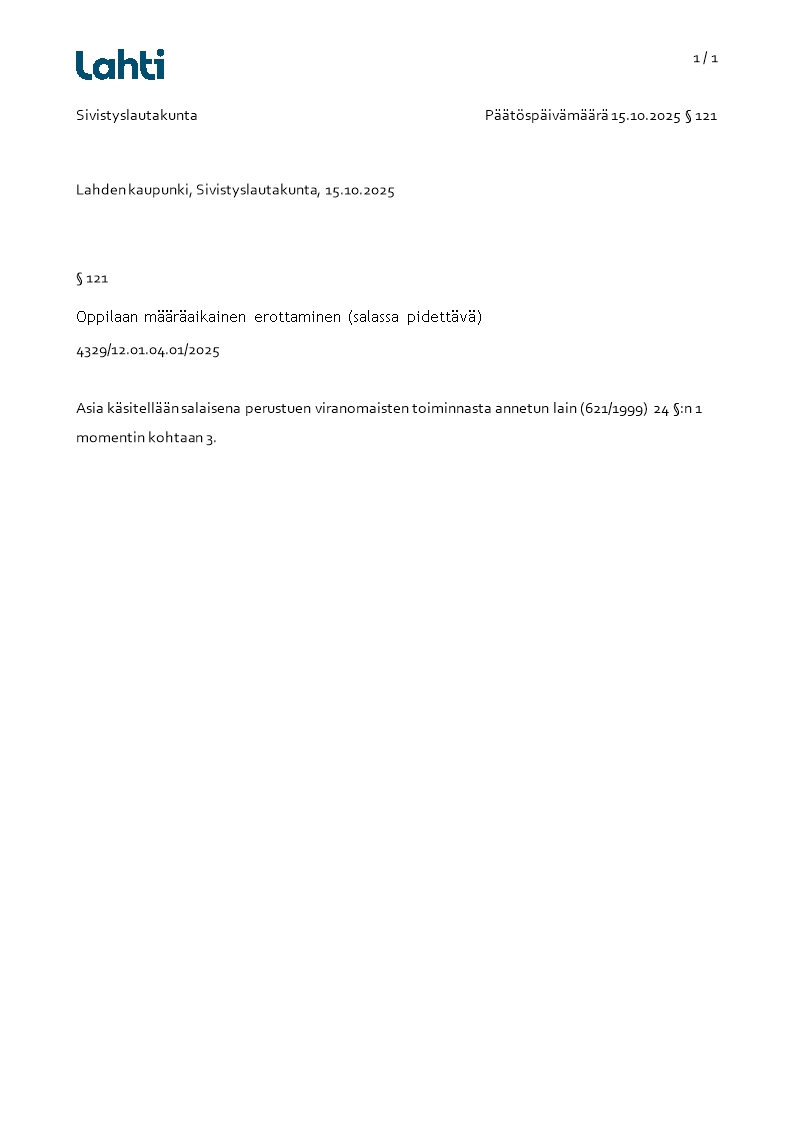 Pöytäkirja 15.10.2025/Pykälä 121