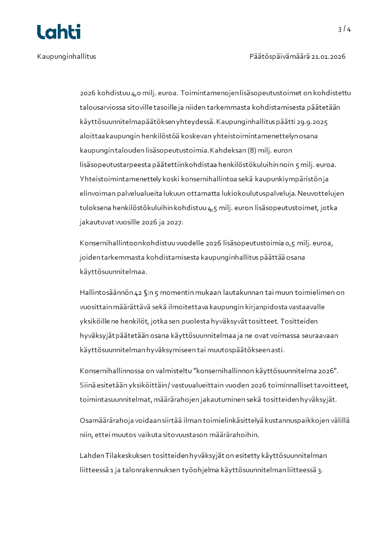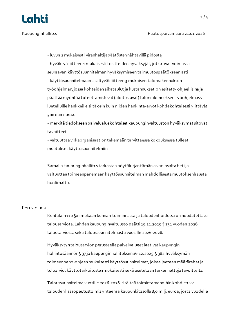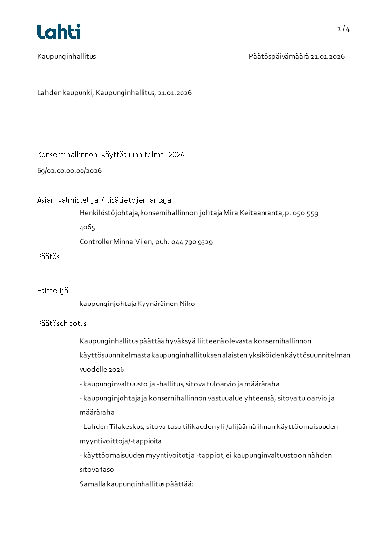 Konsernihallinnon käyttösuunnitelma 2026